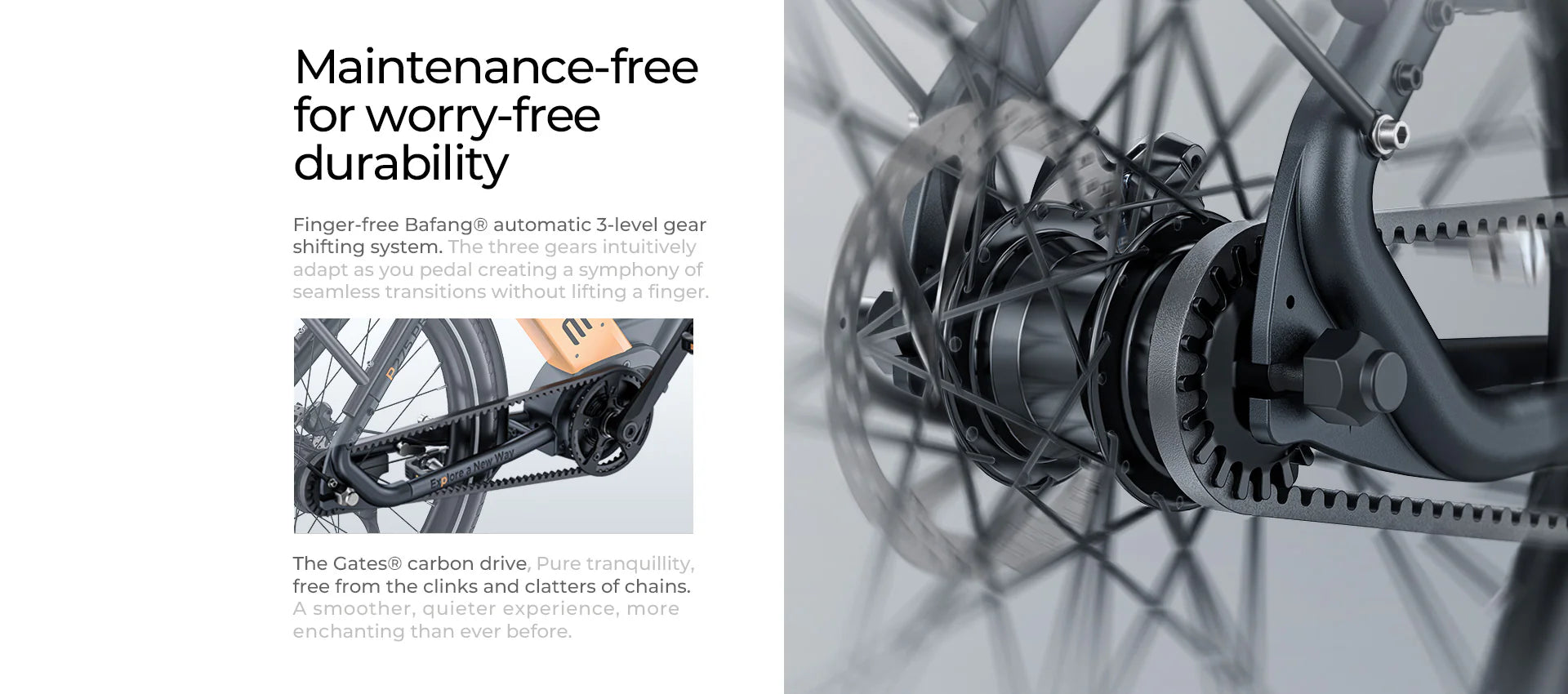 - Sistema di trasmissione: cambio automatico Bafang a 3 livelli Cinghia: cinghia in carbonio Gates